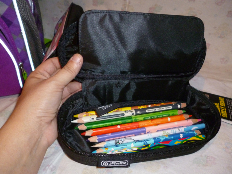 Канцелярские принадлежности и прочие нужности для наших детишекКупили ранец, уже о нем писала. Цена (5400 руб) со скидкой 3146 руб, в подарок положили карандаши.