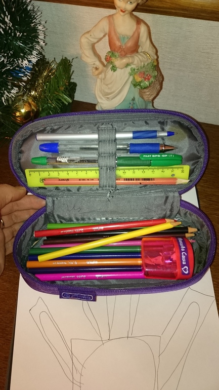 У нас 2 пенала: один- раскладушка с ручками, простыми карандашами и ластиками и т.п, второй -косметичка с цветными карандашами.