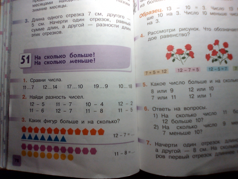 ну так ужеж записано у вас 12-7=5(шт. или ф.) на 5(шт. или ф. поностью слово пишем) больше пятиугольников, чем треугольников.