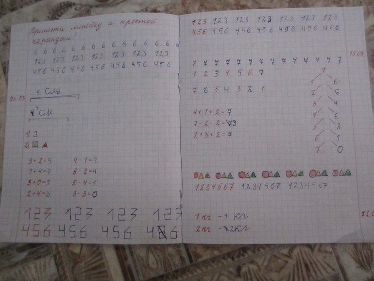 Хорошо чертит, ловко пользуется линейкой. Любит конструировать что-то из геометрических фигур или подручных материалов. Для этих целей еще давно купила в Ашане счетный набор.