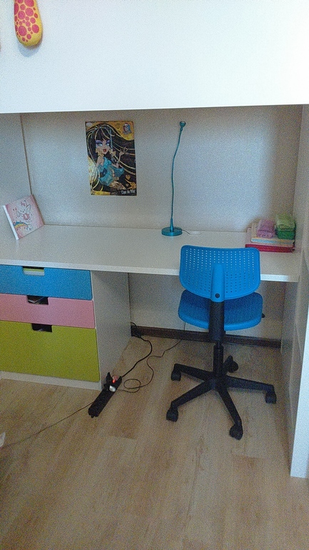 Стол рабочий из Икеи, который регулируется по высоте, достаточно большой, чтобы на нем поместились монитор, принтер, учебники, подросток и репетитор/родитель.