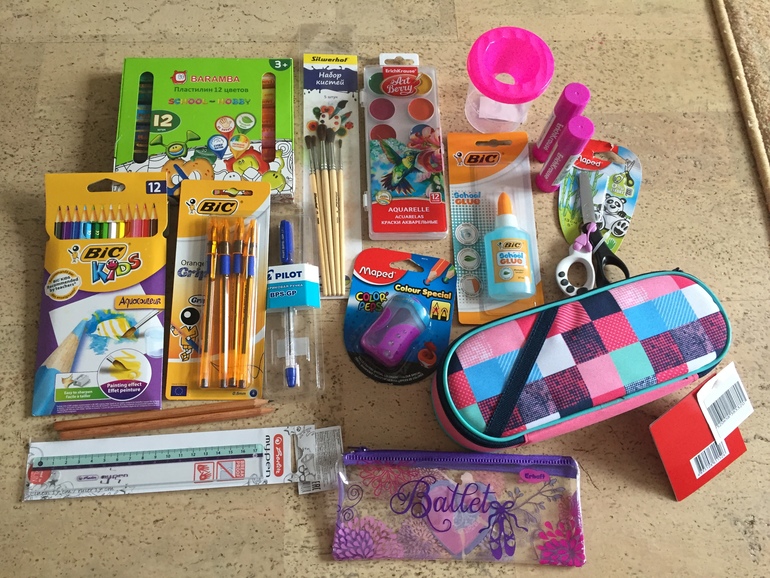 Мы пока купили только рюкзак, цветную бумагу, картон цветной и белый, цветные карандаши Эрик Краузе, очень хорошие на первый взгляд. Мягкие на равне с акварельными идут. Ручки взяла на пробу сейчас три разных. Пока тестируем дома. Но уже выявили какие плохо пишут и какие не удобно держать. Вот как брать одну ручку в нескольких экземплярах. Если в итоге не удобна она или мазать будет...