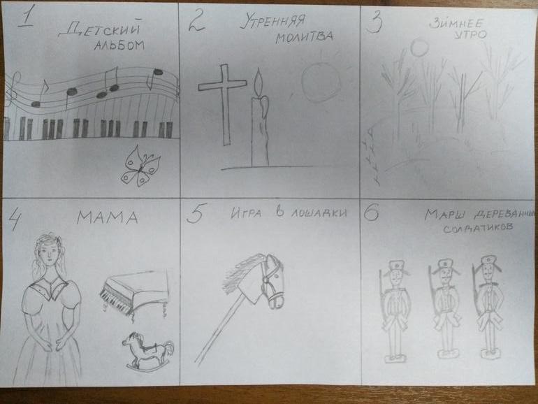 Надо нарисовать 20 картинок по пьесам из Детского альбома Чайковского....в таких вот квадратиках. Рисовала на работе я, ребенок дома разукрашивал.