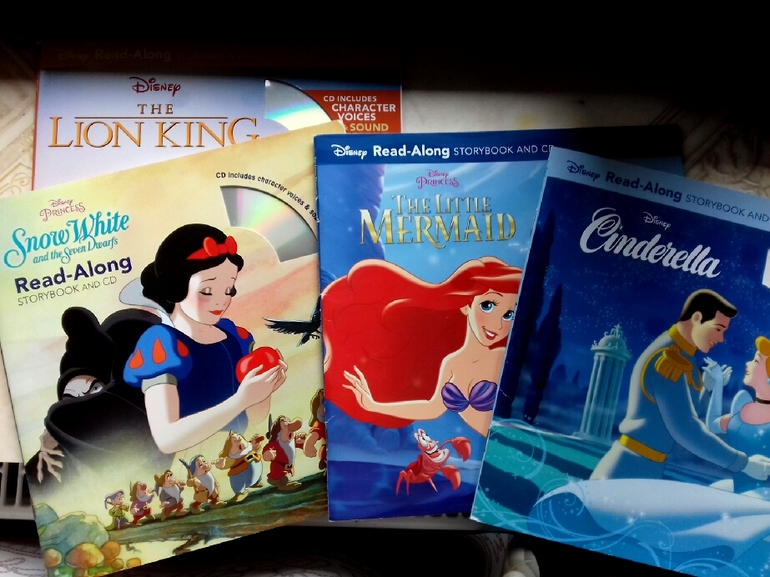 На Амазоне я купила детям книжки по любимым мультфильмам с дисками. Очень удобно слушать аудио - спектакль и следить по книге.