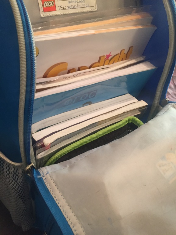 В ранец приходится и коробочку для ланча класть и сменку,папка у нас в школе,у старшего не разрешали, потому что сами мамы и ругались же,что в школе из папок все пропадает.