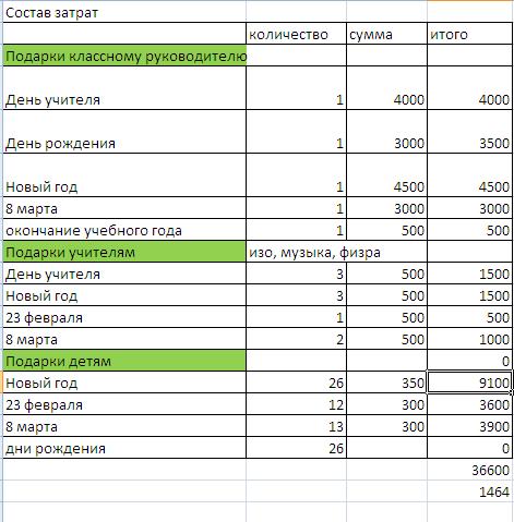 сюда добавились еще затраты на окончание учебного года (торт учителю и пряники детям).