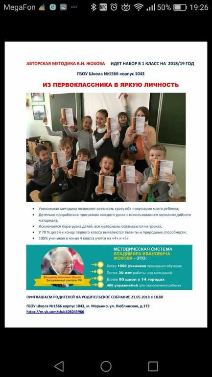 Продолжается набор первоклассников в школу 1043 в Марьино в класс обучения по методике В.И.Жохова.