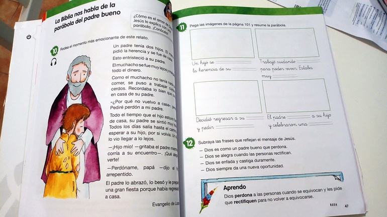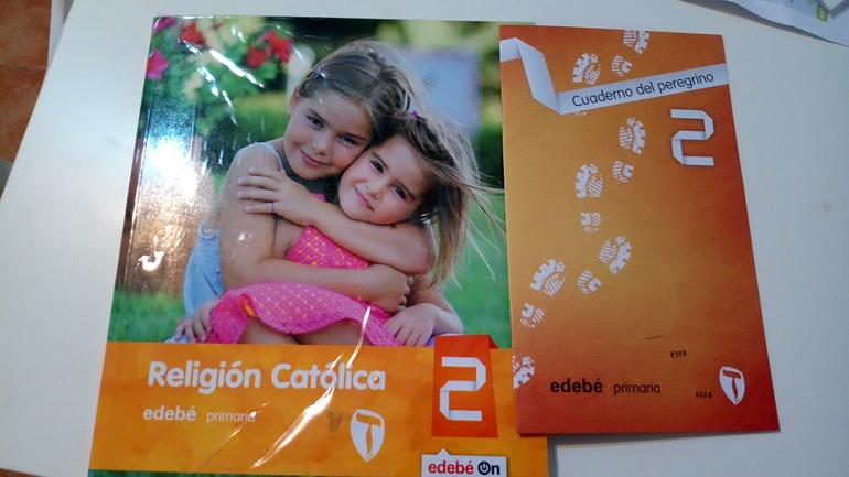 Католическая религия, к счастью, не пять часов в неделю, как в прошлом году🙄 а всего один. Прилогается Тетрадь пелигрима, в Испании проходят религиозные шествия пелигримов. В тетради надо отмечать не шествия, а свои добрые дела.