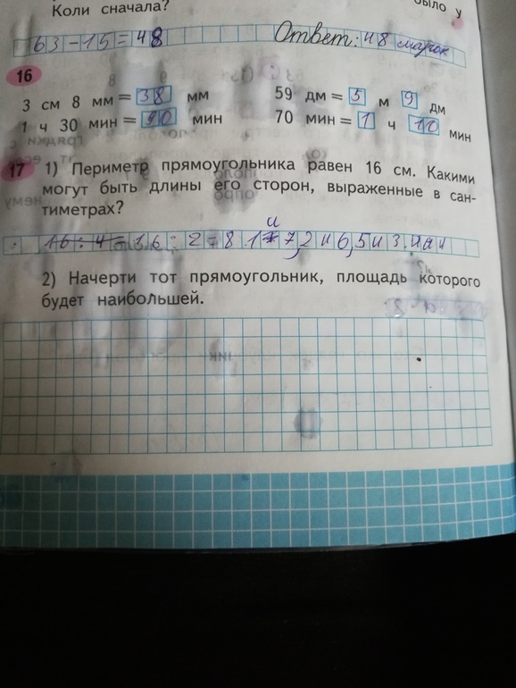 Задача 17. Возникает вопрос, проходят ли в 3 классе что квадрат - это частный случай прямоугольника или нет? Т. К. самая большая площадь как раз у квадрата. Подскажите пожалуйста, кто точно знает, спасибо) Программа школа России.