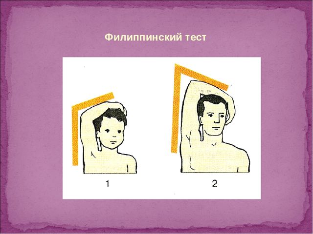 У взрослого это не вызывает затруднений, у школьников - тоже, а вот 4 - 5-летний ребенок не может этого сделать, поскольку его руки еще коротки. В этом случае филиппинский тест дает отрицательный результат.
