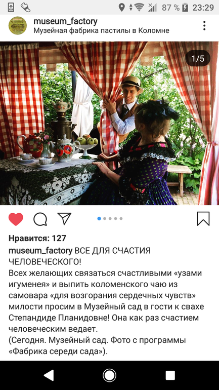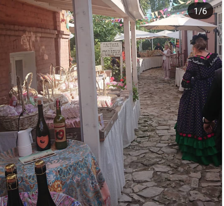 Приехали туда в 14.00, час прошлись по местному рынку и успели посидеть в кафе попить чай, поесть вкусных пирожков в красивом уютном интерьере конца 19го века. В 15.00 нас пригласили в дом, показали, как готовили пастилу, потом проводили в сад на сватовство в гости к свахе 🔥, а потом мастер-класс по зефиру - это больше для детей подойдёт.