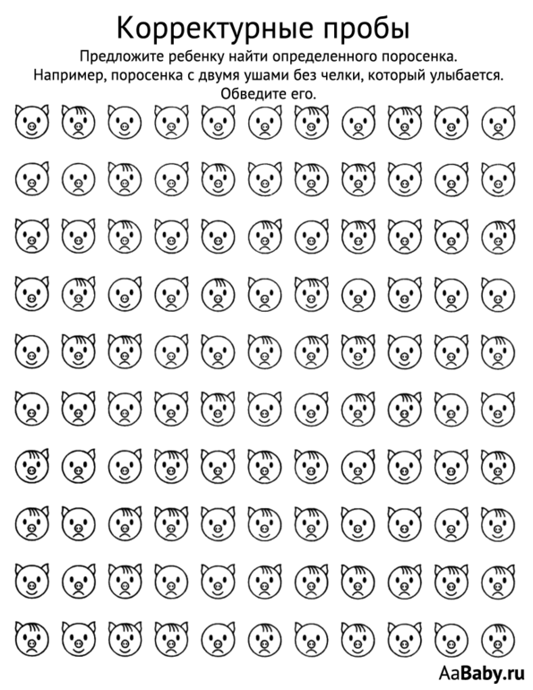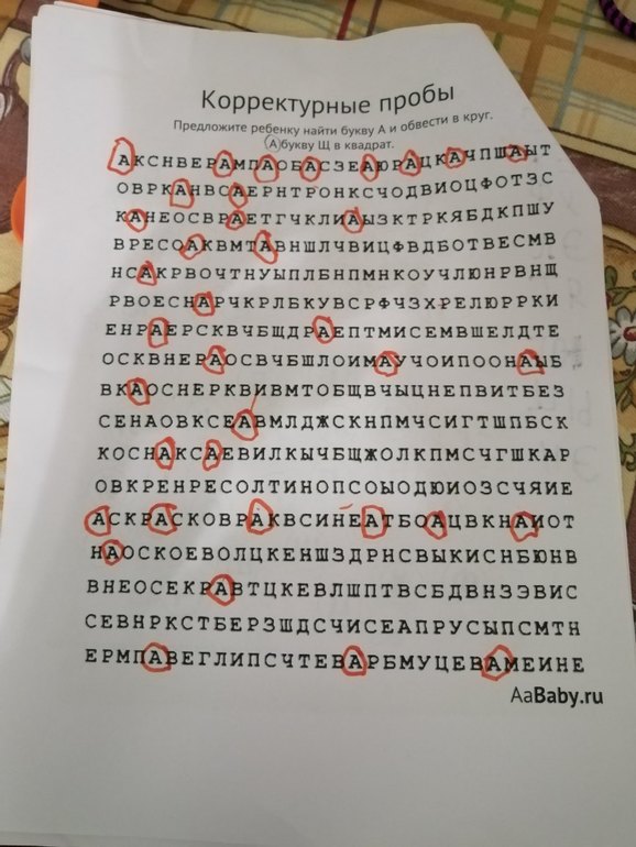 Забегая вперед расскажу, что после прохождения комиссии мы стали заниматься тренировкой внимания. Психолог нам порекомендовал использовать таблице Шульте, есть онлайн-тренажеры, и кольца Ландольта. Мы занимались по корректурным пробам. Логопед и педагог на подготовке школе сообщили, что предложенный тест на ТМПК не на наш возраст. Вот так выглядят корректурные пробы на наш возраст: