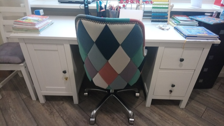 Спасибо! Да, кресло нам тоже очень нравится, делали на заказ, а вот от стола, честно не в восторге - большой, но бесполезный, хочется больше ящиков по бокам, со временем будем менять...