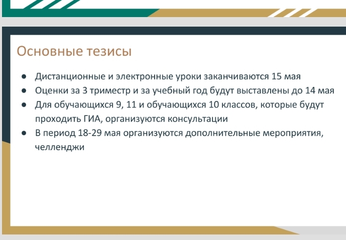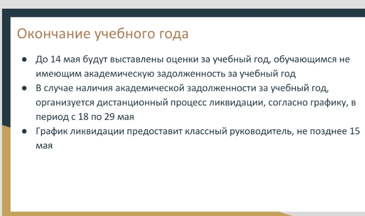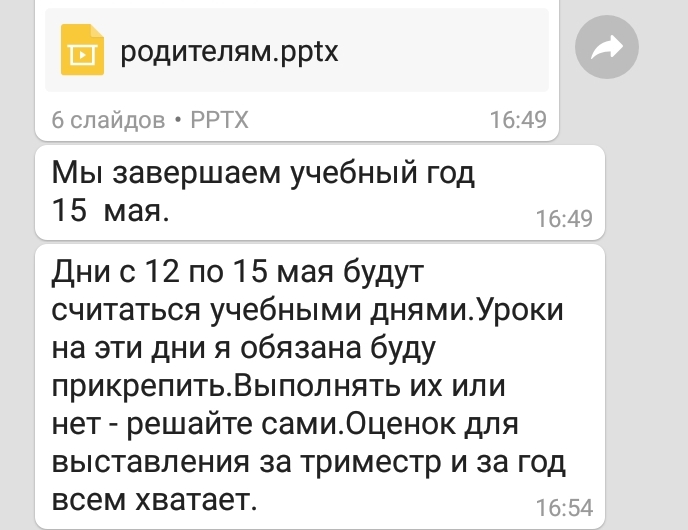 У нас молчат. Родительский комитет в чате писал о долгом-долгом обучении, июнь и возможно часть июля. Но я думаю бред несут, учебники уже заканчиваются... на май-то не хватит)