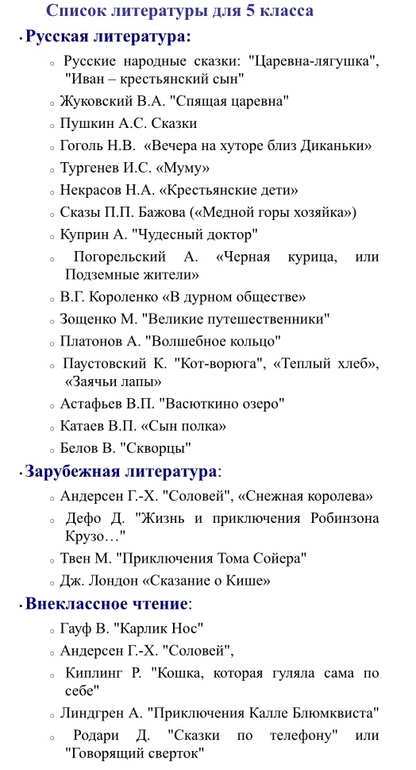 Откройте оглавление учебника в 5 классе и читайте. У нас список с оглавлением совпадает. Прочитали уже мифы древней Греции, хозяйку медной горы, черную курицу, сейчас читает Робинзона Крузо.