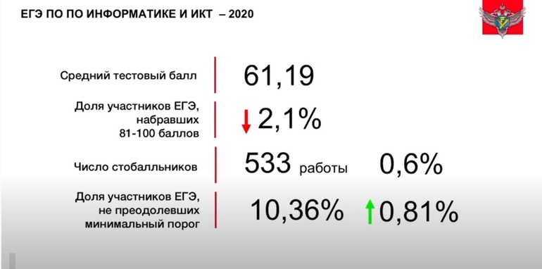 Результаты ЕГЭ по информатике, по словам Музаева, оказались сопоставимы с прошлогодними: средний балл остался практически на том же уровне, как и доля сдающих, не преодолевших минимальный порог. Доля работ на 81-100 баллов сократилась на 2,1%, всего в стране написали 533 работы на 100 баллов.