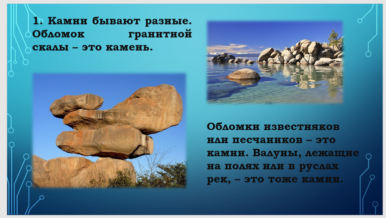 При создании презентации на слайд лучше размещать картинку и самый минимальный минимум информации. Пусть своими словами скажет, а прочитать дети и так смогут сами.
