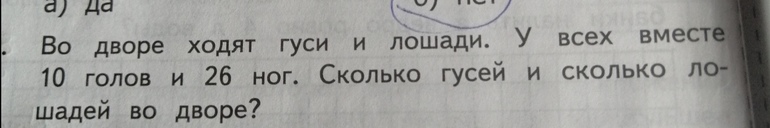 Значит не хватает 6 ног. 1 голова это 2 доп ноги, 6\2=3. Итого меняем 3 головы на лошадей. Выходит 7 гусей и 3 лошади.