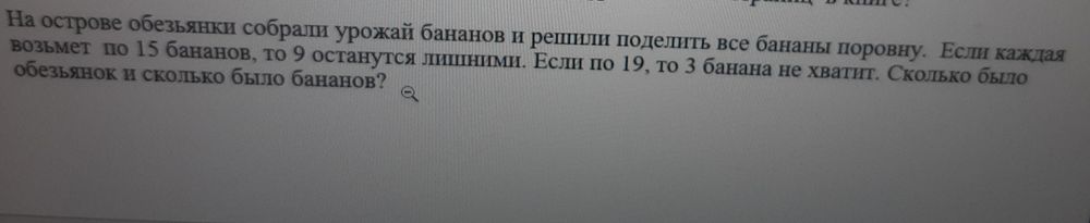 Я решала подбором. Если у нас 2 обезьяны, то в первом условии 39 бананов,во втором 35 бананов, не равно. Значит берём следующее - 3 обезьяны. 1. 54. 2. 54. Равно. Значит 3 обезьяны и 54 банана