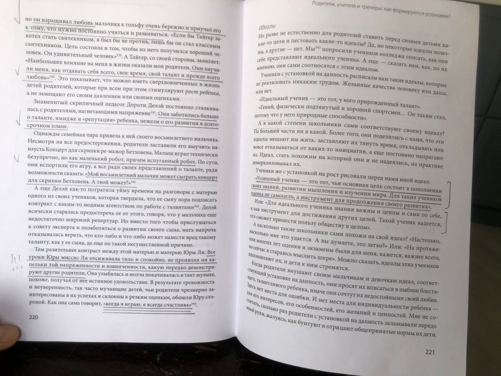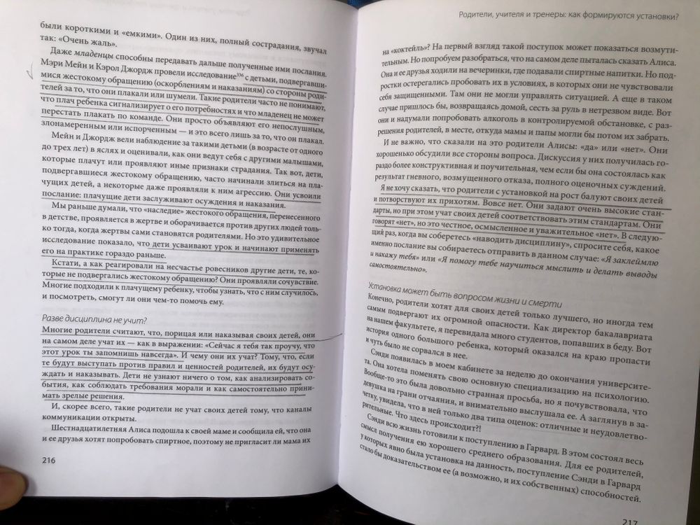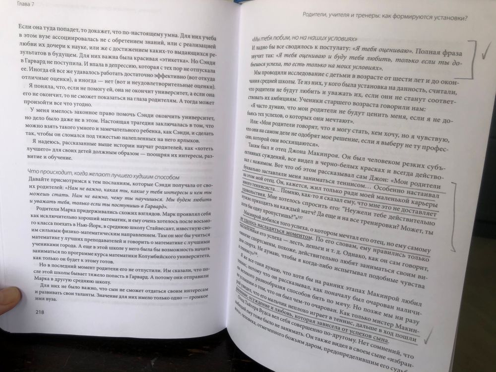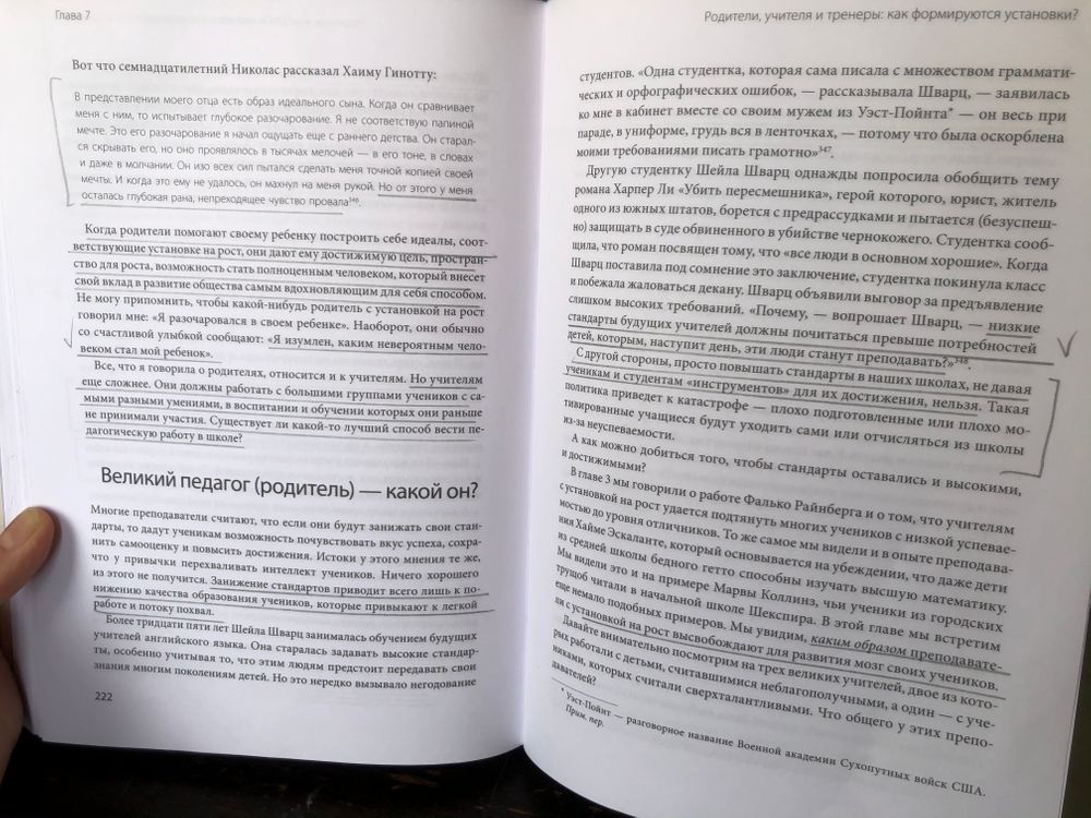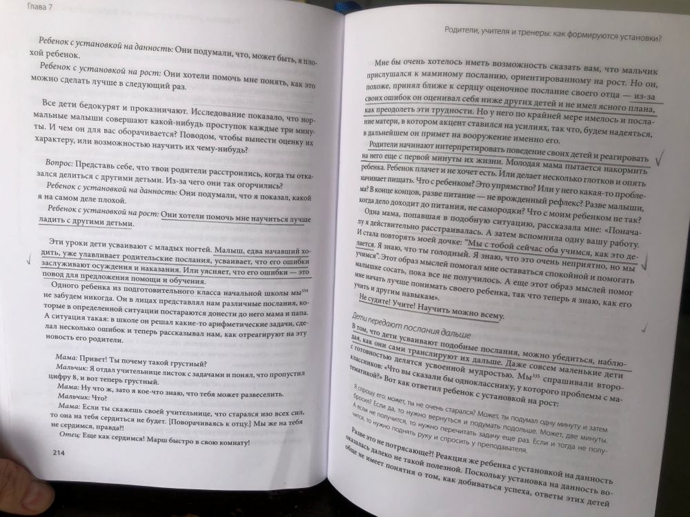 Сразу скажу: книга просто замечательная и очень необходима родителям, учителям, бизнесменам, да и вообще всем... Автор научно доказала влияние внутренних установок на личность. Суть книги в том, что существует 2 основные установки: установка на данность и установка на рост. И какая установка будет двигать человеком и что этому способствует: какое поведение родителей, учителей, тренеров, боссов, руководителей. Так же в книге затронуто много подводных камней в каждой теме, например в теме учебы затронута тема буллинга: как вести себя и как взаимодействовать с детьми, если Вы с этим столкнулись. Кратко: люди с установкой на рост не просто ищут возможность испытать себя. Испытания- это почва для их роста. Ошибки и проигрыши они не воспринимают как поражение, для них это толчок а развитию. Они находятся в движении и жажде знаний. Люди же с установкой на данность процветают только когда они находятся в безопасности и контролируют происходящее. Как только они встречают сложные задачи они перестают чувствовать себя умными и талантливыми и теряют к делу интерес. В книге затрагивается так много жизненных аспектов: от чего зависит построение отношений между мужчиной и женщиной, в бизнесе, между ролителями и детьми, между учителями и учениками, между тренерами и спортсменами. После поста выложу некоторые страницы, но честно говоря практически каждая на вес золота и практически каждая страница изобилует нужной и важной информацией. Поэтому лучше Вам прочесть ее самим. Но конкретно в этом посте я затрону тему про учебу и успешность наших детей, опираясь на эту книгу.