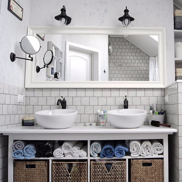 очень симпатичная ванная комната Светланы из Нижнего Новгорода. Ничего лишнего. Консоль с корзинками это Хэмнес из Икеа а сверху лежит столешница. Отличная идея #simplethings_идея И обратите внимание на полки-картины, еще одна идея для хранения.