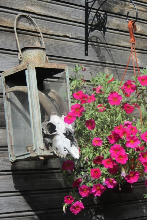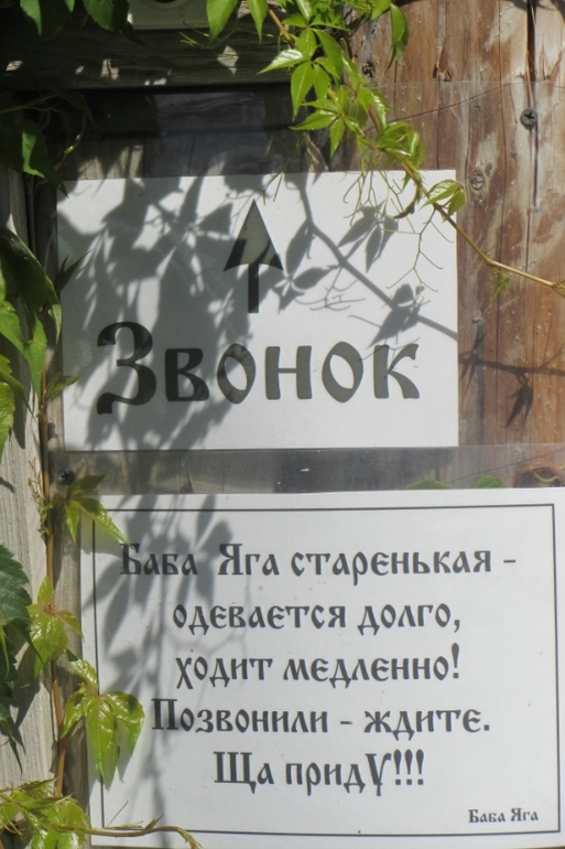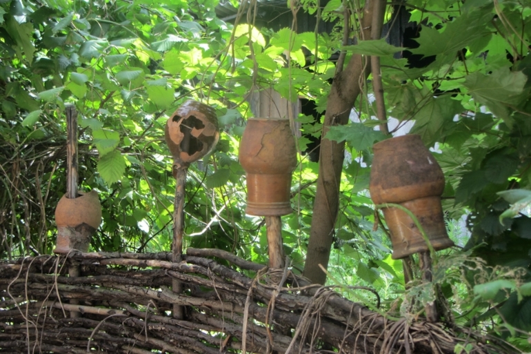 Уже в маленьком дворике есть на что посмотреть: разбитые горшки и крынки на плетени, наличники и черепа животных