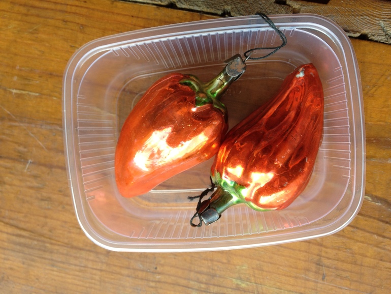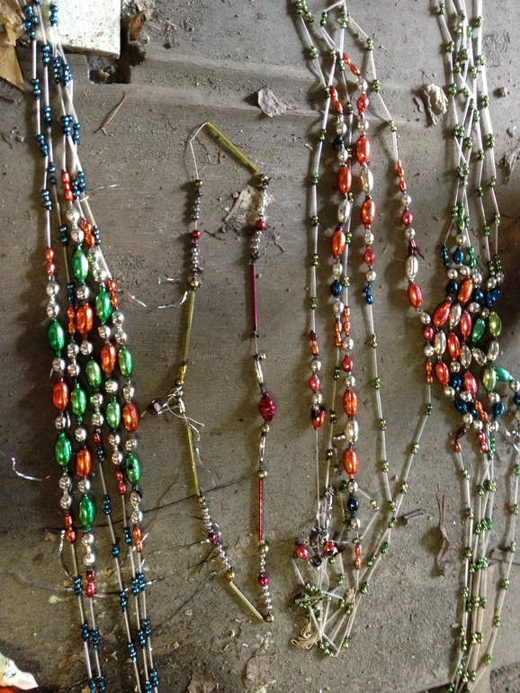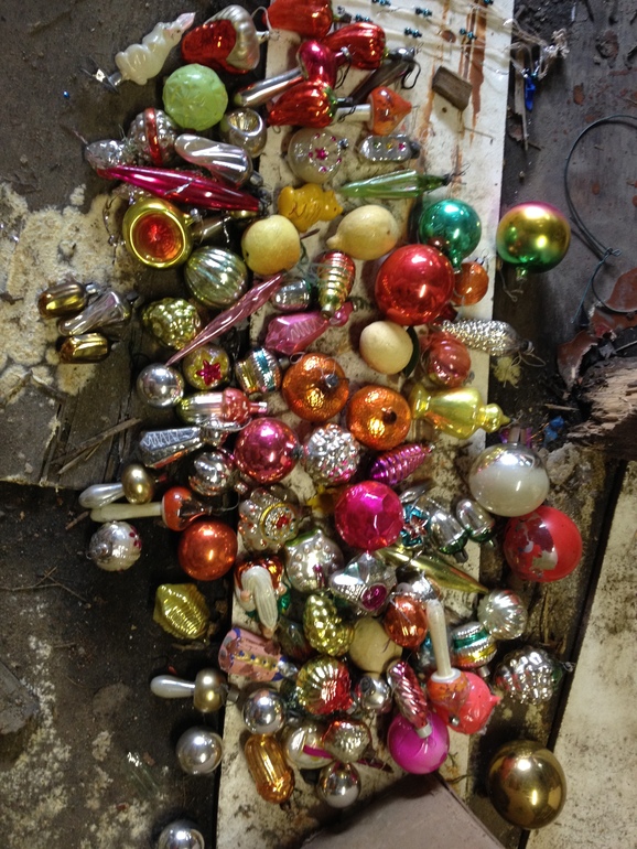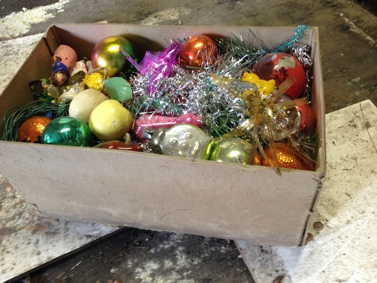 Во втором ящике лежали старые елочные игрушки! Многие разбились, это очень печалит, но есть очень хорошенькие сохранившиеся экземпляры! Я впервые видела настоящие елочные бусы! Все это богатство я раскладывала прямо на полу гаража, сортировала, примеряла (бусы), кое что в виде контрабанды (тайком от мужа) привезла в городскую квартиру, планирую на новый год украсить ими елку. Хочу поделиться фото моего восторга!