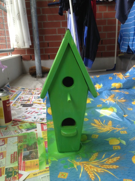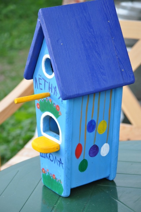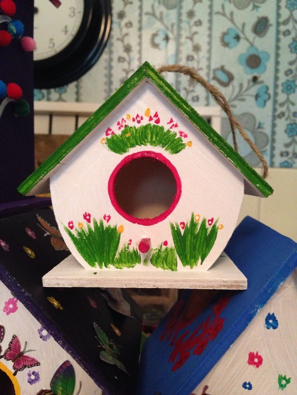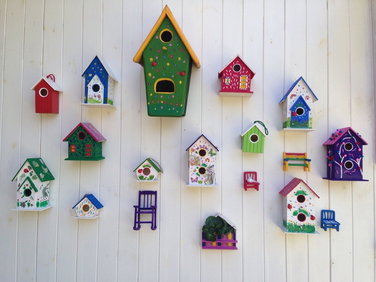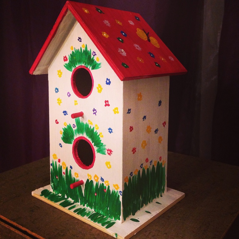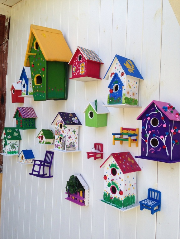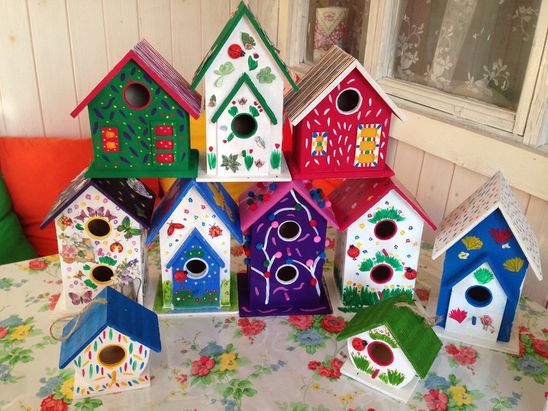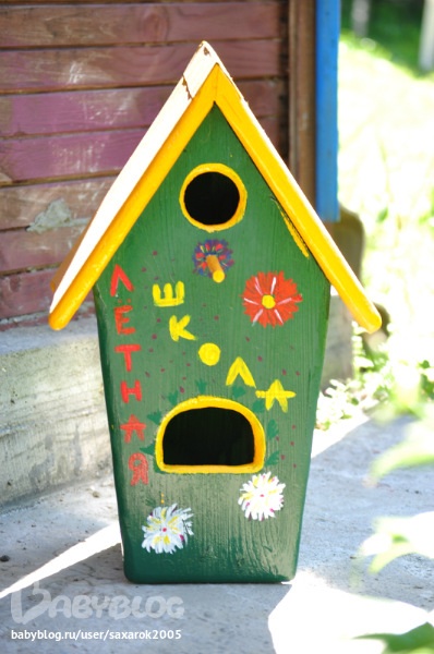 Как то давно, я в Германии увидела скворечники. Они конечно декоративные, не для птиц. Все разной формы, всех цветов радуги и с разными надписями. Как увидела, заболела ими. Они не маленькие, и везти из Германии скворечник было как то....))))) не очень. Тем более я тогда уже поняла, что одного мне будет мало. Мы вернулись, и спустя время выпилили из сосны скворечник. Он был первый. И самый любимый). Красить, рисовать и даже срисовывать я никогда не умела. В школе по изо у меня честно было 3 с натяжкой. Это вообще не мое. Но тут как то более менее получилось, что то намалевать на скворечнике))). Затем был второй. Он по краскам получился хуже. Купила один цвет, а на деле оказался намного темнее. Затем был третий, его мы подарили брату на свадьбу), и четвертый сделали сестре, пока находились в Германии. Она как раз у нас почти))) художник. Одно время даже картины рисовала. И она умея это хорошо делать, никак не раскрасит свой скворечник. Подходит к делу со всей ответственностью)))). Не то что я). После этих четырех самодельных скворечников из сосны мы перестали их делать, и я как то про них и думать забыла. А тут я зашла недавно в магазин Леанардо. И вдруг вижу скворечники стоят. Они конечно не такой формы, как немецкие, а обычные такие, как у нас вешают для птиц. Но я почему то взяла два. Купила красок, кистей. И понеслось.... Я красила две недели без остановки. Приходила домой и ждала скорее вечера, чтоб все улеглись и я села красить. Ходила через каждые два дня в Леонардо и покупала еще и еще и еще))). Это оказалось своего рода психотерапией))). Как сажусь красить, сразу становлюсь спокойной, мне так хорошо, как заканчиваю опять нервы начинаются.))) в общем раскрасила я 12 скворечников. И вроде как успокоилась). Отвезла их на дачу и повесила на внешнюю стенку веранды. Но эти скворечники не из сосны(((, а из фанеры. Они конечно за зиму развалятся. Так что их придется убирать уже скоро. А наши скворечники из сосны сделаны на все времена. Сверху на крыше лежит жестяная полоска, которая закрывает стык крыши, все его щели пропитаны герметиком, и ему ничего не страшно. Он висят уже года два или даже три и прекрасно сохранились). А теперь фото: