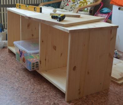 Изначально планировался просто стеллаж для игрушек. Детские игрушки мы храним в прозрачных пластиковых контейнерах - видно, что и где, но ничего не пылится. Под размеры контейнеров я нарисовала эскиз, посмотрели мебельные щиты, с учетом толщины щитов рассчитали размеры заготовок.