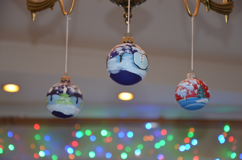 Шары, расписанные вручную, оказались большими для нашей маленькой елочки, поэтому нашли свое место на люстре.