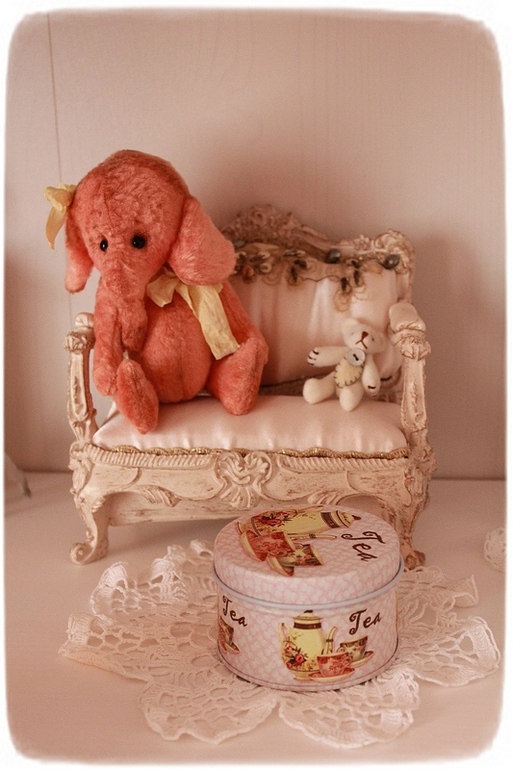 Слоник это моя работа, очень хотела освоить теддиков, вот сходила на МК и сотворила там это розовое чудо.Ну а к нему чудесно подошла вот эта розовая баночка из Наташиного магазинчика. Теперь на полочке царит полная гармония.