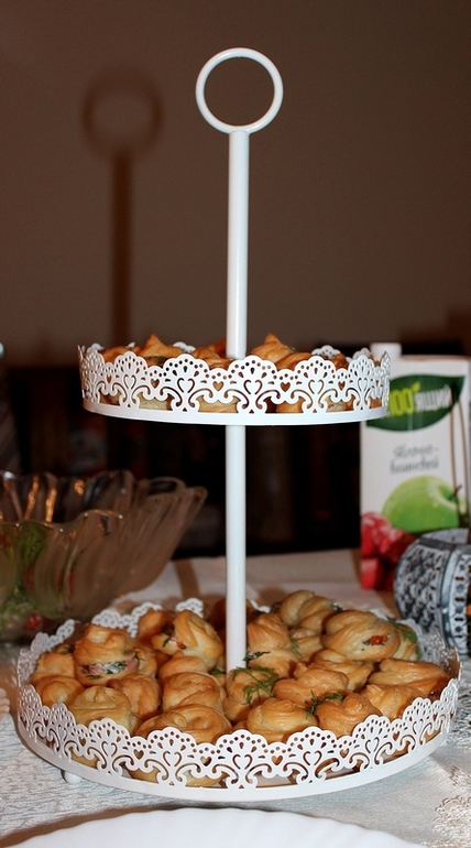 Ажурная подставка для капкейков украсила наш новогодний стол и отлично вместила в себя порцию профитролей, начиненных семгой и красной икрой (праздновать, так праздновать!
