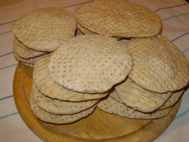 Вкус мне очень понравился, такой весь тминный, свежий. Сезам не чувствовался, а вот семечек подсолнуха у меня не было И достаточно соленые получились. Но это нам не помешало их есть с вареньем (у нас было малиновое, но думаю, что из черной смородины подошло больше (но не растет она у нас, вот и не готовлю варенье, а очень жаль)). Пока были теплые и свежие-супер. На утро были уже резиновые (как, впрочем, и любая пицца). Тостер ситуацию исправил, и мне так Knackenbrod-цы даже больше понравились. Думаю, что если их делать меньшими в диаметре, то из тех, что сразу не съедятся, стоит сделать на итальянский манер biscotti per i Vichingi или biscotti per i viggiatori и сложить в сканди-жестянку.
