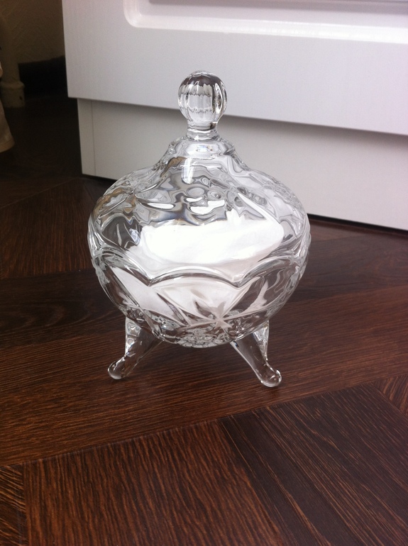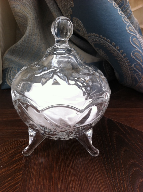 Она совсем крошка, милая и пузатая, сейчас там будут жить мои ватные диски. Так как конфеток там поместится максимум три-размерчик, не на наш аппетитик