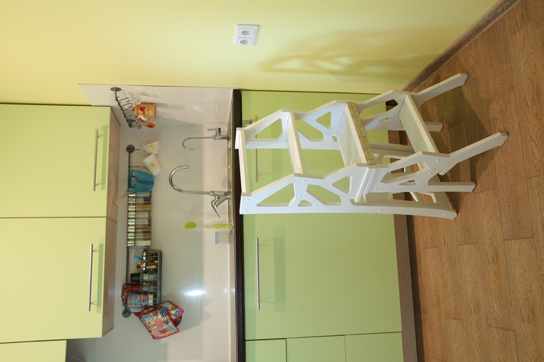 Ответ казалось бы прост, купить стремянку, но куда ее ставить, балкона нет((( шкафы впритык под вещи. И вот мой дорогой муж сделал мне стул-стремянку. На мой взгляд это шедевр!!! Как Вам?