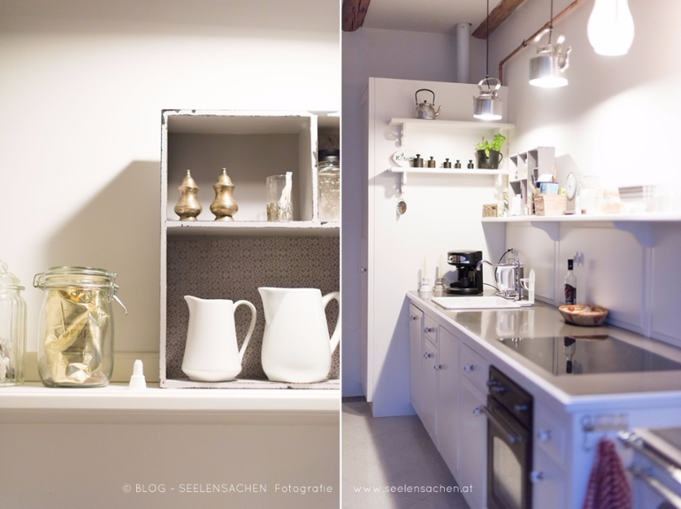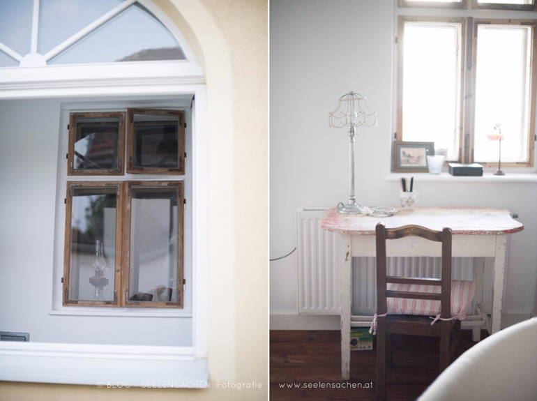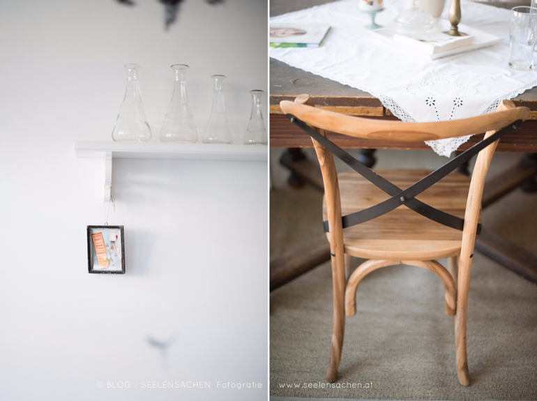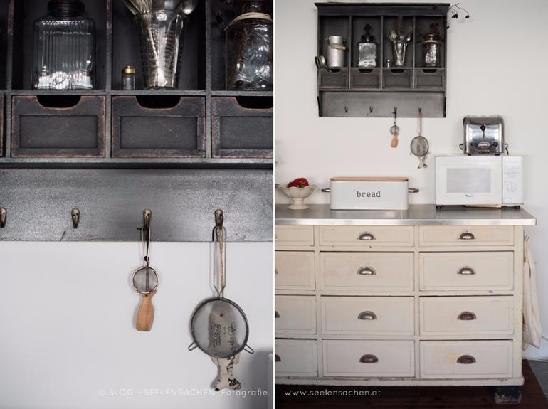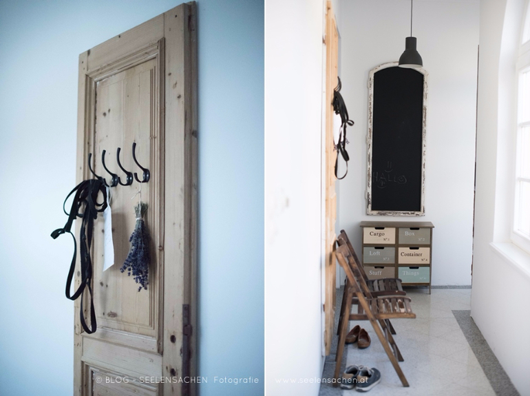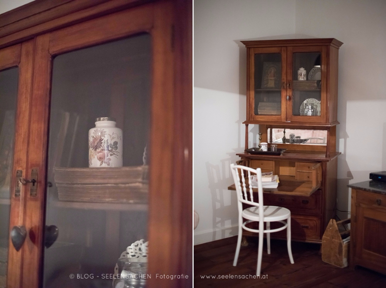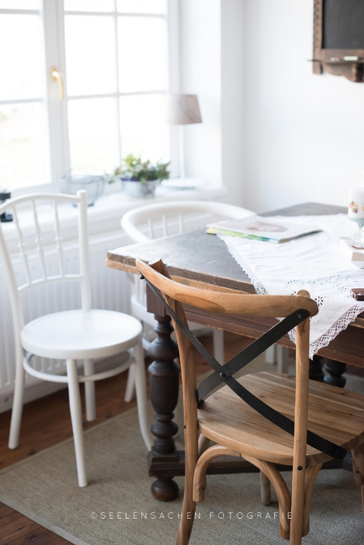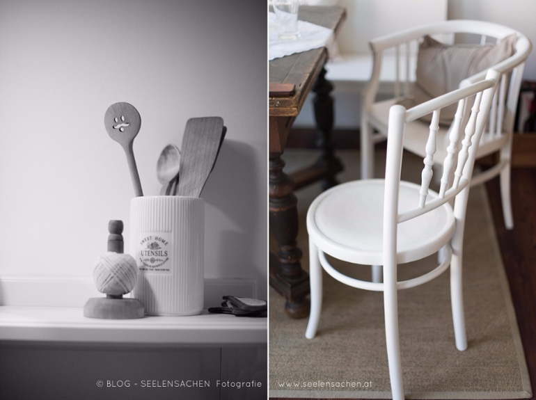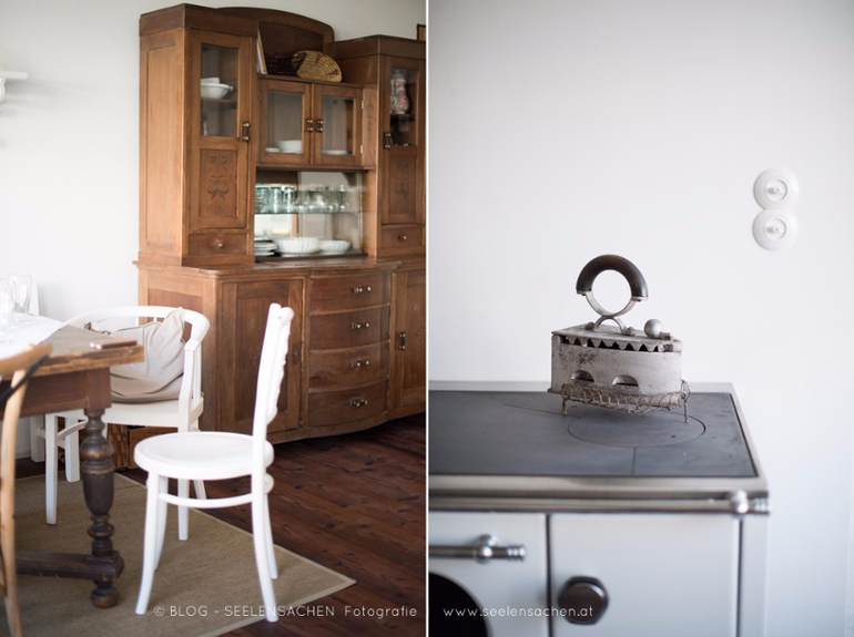 Тут столько интересных деталей - сервировочные тарелкки в форме рыб и морской звезды, необычная спинка-ремень у стула, глиняный "бидончик" в буфете, оригинальный сервировочный столик на колесах, старая дверь-вешалка, ретро-утюг...