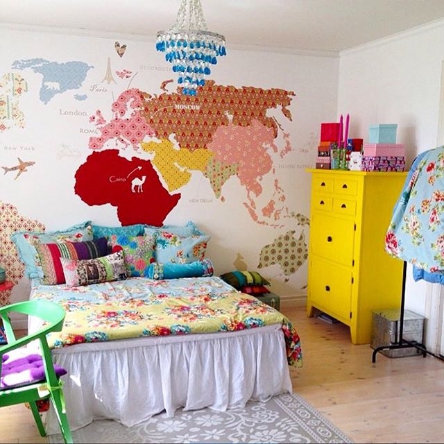 Стена с текстильной картой меня покорила!!!! И идея с зеркальным шаром, рассылающим по комнате солнечных зайчиков, восхитительна! ✨⚪️✨