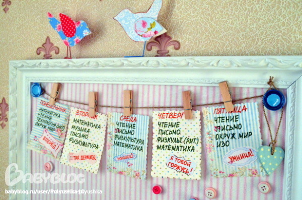 Прошу помощи, хочу сделать расписание ребенку в стиле скрапбукинг, можно на доске, которая висит у него. Есть идеи?
