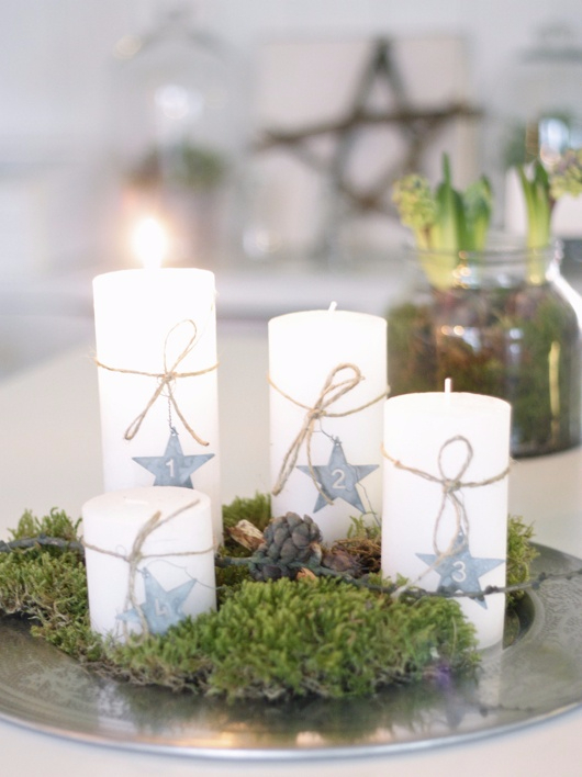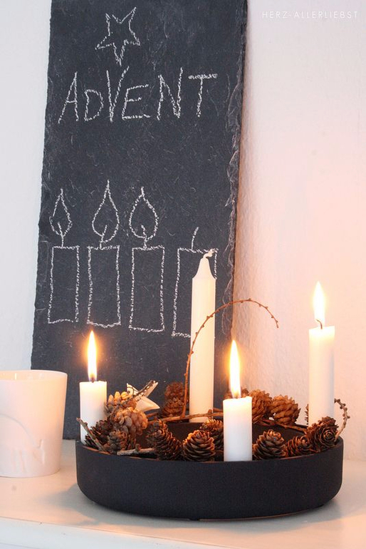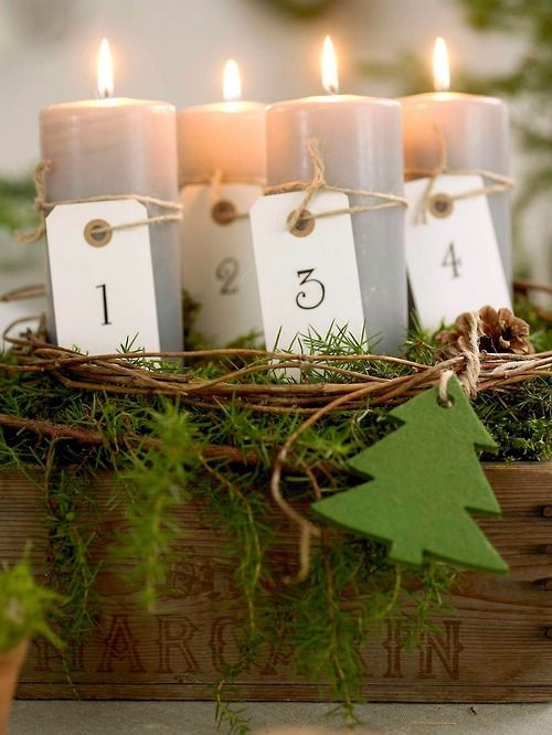 Классический европейский адвент-календарь делается из еловых, сосновых веток, скрепляется проволокой в круг. На венке устанавливается 4 красных свечи - символ четырех недель Адвента, которые зажигают в каждое воскресенье. В последнее, четвертое воскресенье Адвента, над венком горят все свечи, возвещая скорое наступление Рождества. Свечи символизируют 4 времени года, а венок годовой цикл.