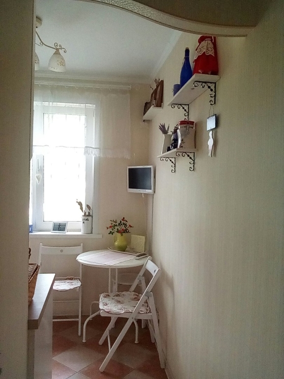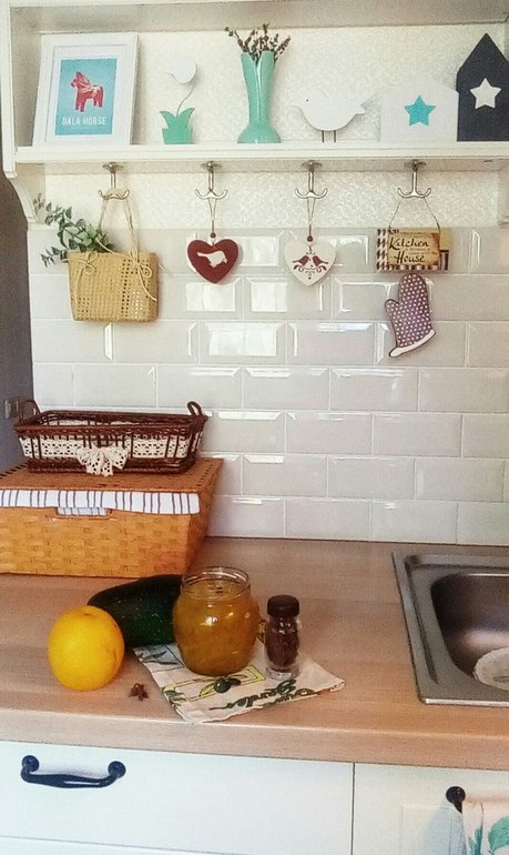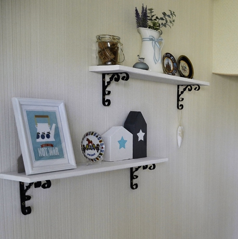 На этот раз обновки появились на моей любимой кухоньке. Долго я присматривалась к полупустой стене у входа на кухню и все же уговорила мужа сделать там полки. Сказано - сделано! Пару досок, краска, готовые консоли - красота!