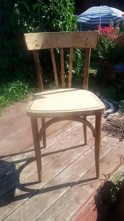Была у меня еще мечта сменить икеевские стульчики на что-то более гармоничное для круглого столика на кухне. Сразу оговорюсь, что ничего против этих стульев не имею - они отличные и нашли своё место в доме! А на кухне появились новые - старые венские стулья)) Соседи по даче, собираясь выбросить такое добро на мусорку, отдали мне их безвозмездно на растерзание)) Немного поработав над ними - шкурка, краска - они стали идеальным вариантом для нашего кофейного столика! Вся семья довольна такими новинками))