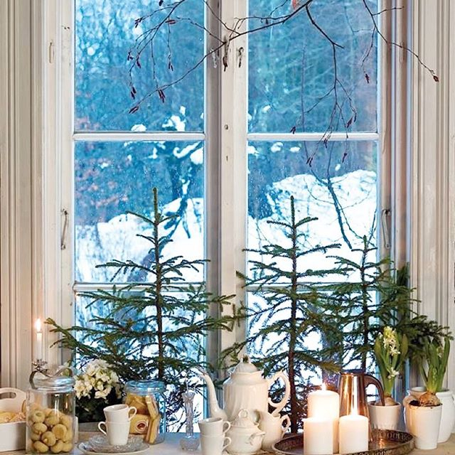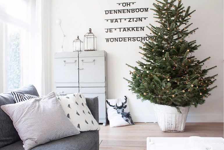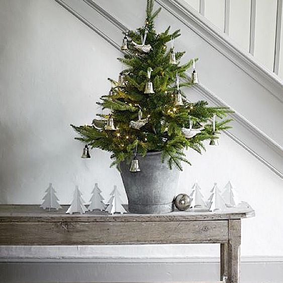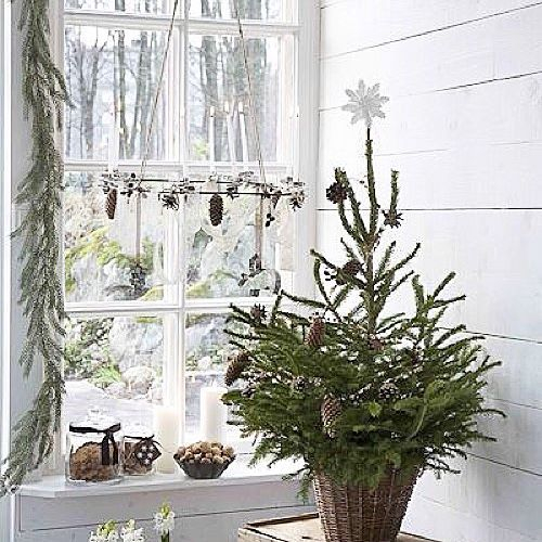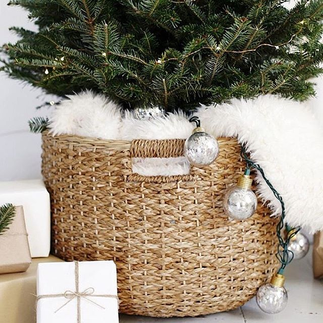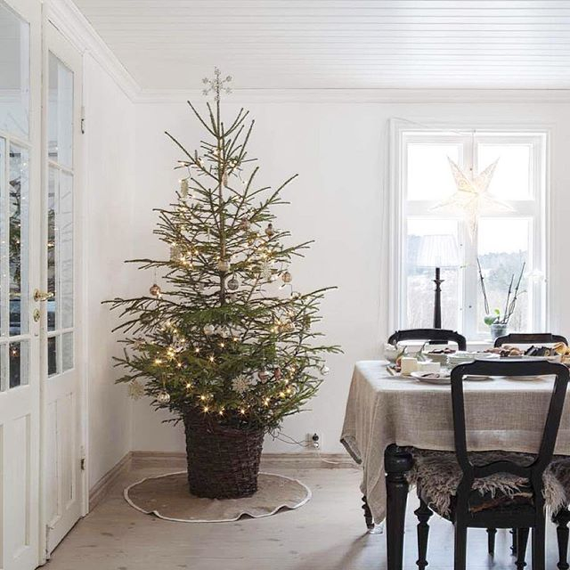 Еще одна характерная особенность - елочки стоят в ведрах, ящиках или корзинах. Выглядит это очень эстетично! Наша елка тоже стоит в ведерке. Но, я его дополняю тканью, типа "золотая порча". И еще, мы который год, мечтаем купить елку с корнями, чтобы после праздника посадить ее где-нибудь.