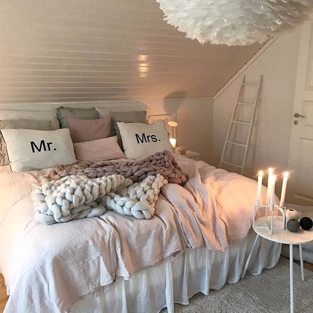 Не пойму , где перебор. Я бы красавицу Наталью из коридора убрала. Постер шикарный, но не для входа. И свечи. А так коридору зачет. Далее мансардная спальная... Привет больной голове называется. Скошенный потолок над кроватью - это увы и ах.