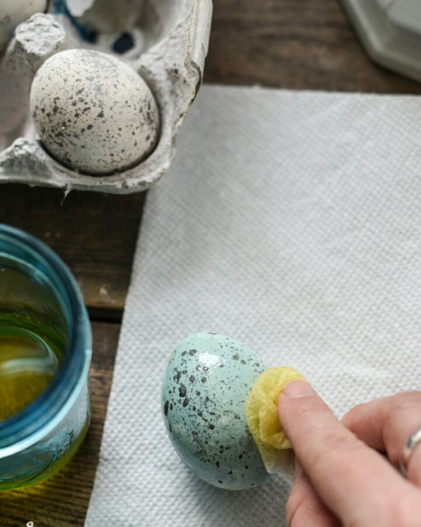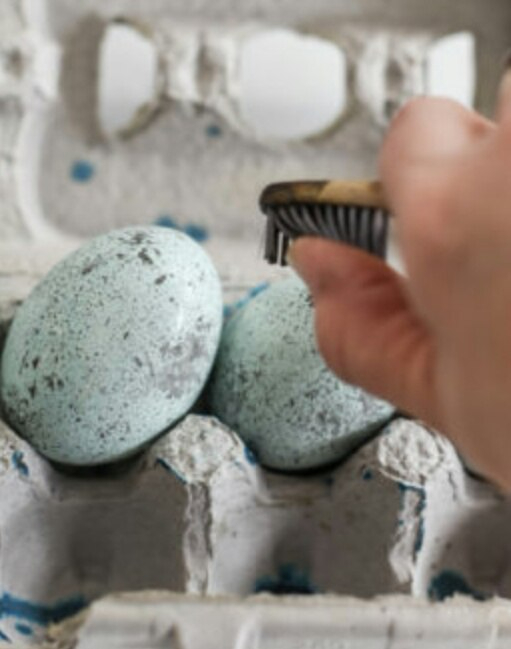 ПраздничноеАвтор использует краски сделанные на молоке, я красила подобным образом, используя обычную пищевую краску. На белые яйца достаточно совсем немного пигмента, у меня получались бледно-голубые. Сначала окрашивала яйца в один тон, потом, когда они подсыхали, брызгала зубной щеткой с более темной краской. Сверху ничем не покрывала, но для стойкости можно покрыть прозрачной пищевой краской. А на фото яйца покрывают в конце конопляным маслом для блеска.