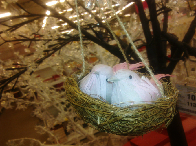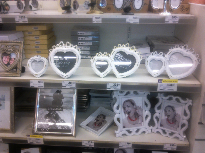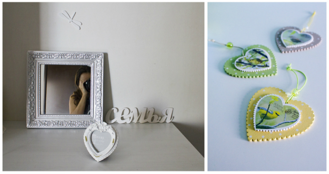 И мои покупки: две рамки-сердца "а-ля-шебби-шик", зеркало в серебрянной раме и сердечки-подвески из дерева. Ага, опять с птицами. Люблю их