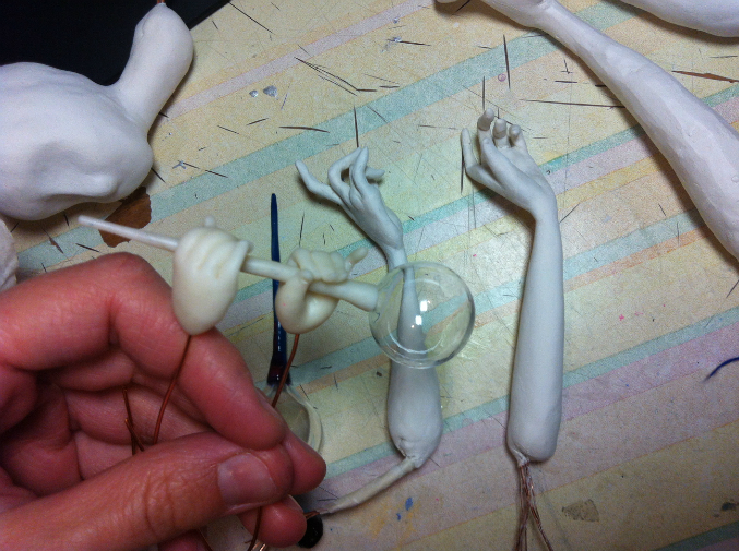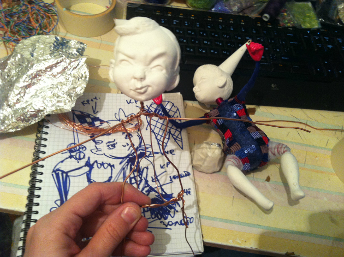 2. Делаем каркас из медной проволоки. уточняем пропорции. Если у фигуры обнажены только кисти рук, ноги до колена и голова, то экономнее и удобнее лепить части тела по отдельности, а потом скрутить все в единое тельце. На фото как раз этот этап. То что будет скрыто под одеждой я "леплю" из фольги, так экономнее.