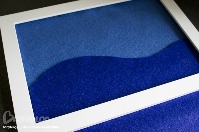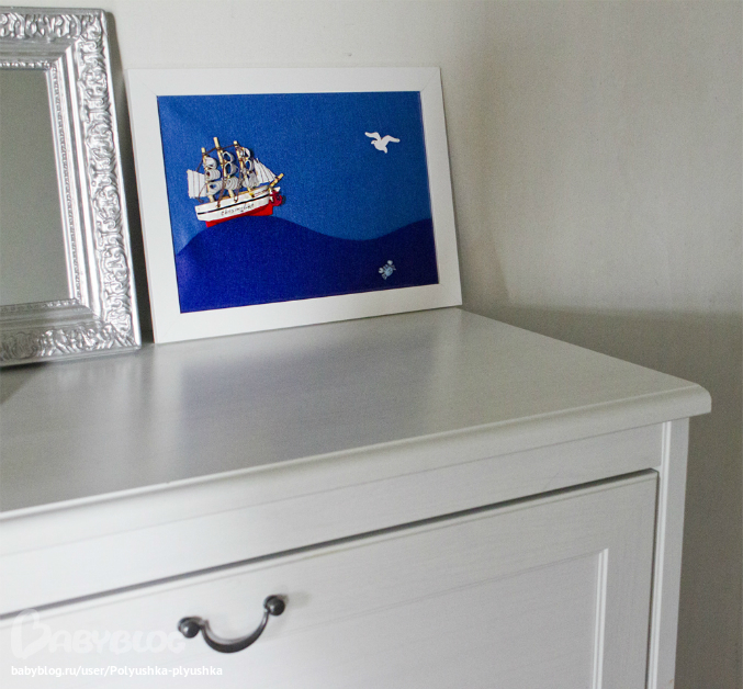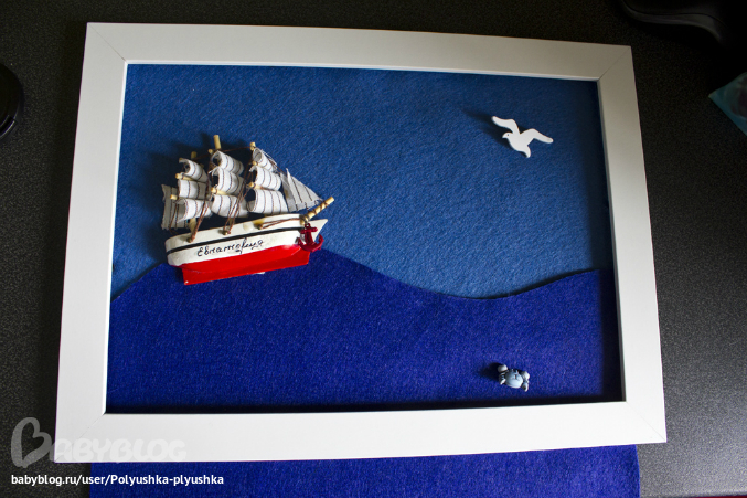 У нас был магнит-парусник, который мы привезли из Евпатории прошлым летом. Еще мне понадобился фетр и несколько пуговок с морской тематикой и простая белая рамка из Икеа.