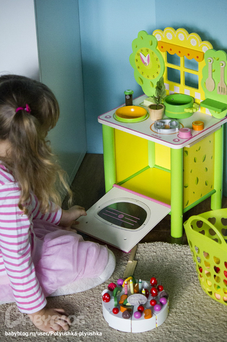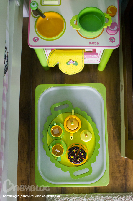 Это наша любимая кухня. В карманах посуда, в ящиках продукты, а под кроватью чайный сервиз. Этот зеленый ящик используем, как переносной столик для завтрака