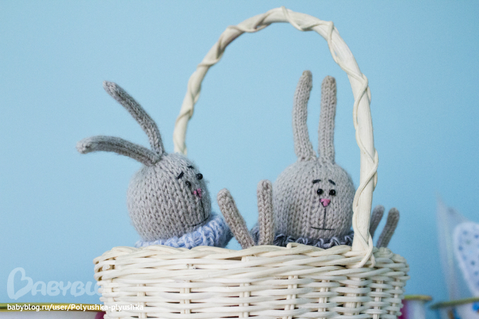 семейство вязанных зайчат, уши детей виднеются из корзинки - мальчик и девочка