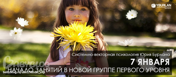 7 января 2013 года начинается новый уровень лекций по системно-векторной психологии Юрия Бурлана. Совсем скоро мамы и папы из разных стран (тренинги проводятся онлайн, и родители могут слушать лекции откуда угодно) начнут узнавать удивительные вещи - о себе, о своих детях, близких, любимых и даже незнакомых людях. Секреты успешного общения, взаимопонимания с самыми дорогими людьми, секреты талантливого воспитания счастливых детей - и многое другое!